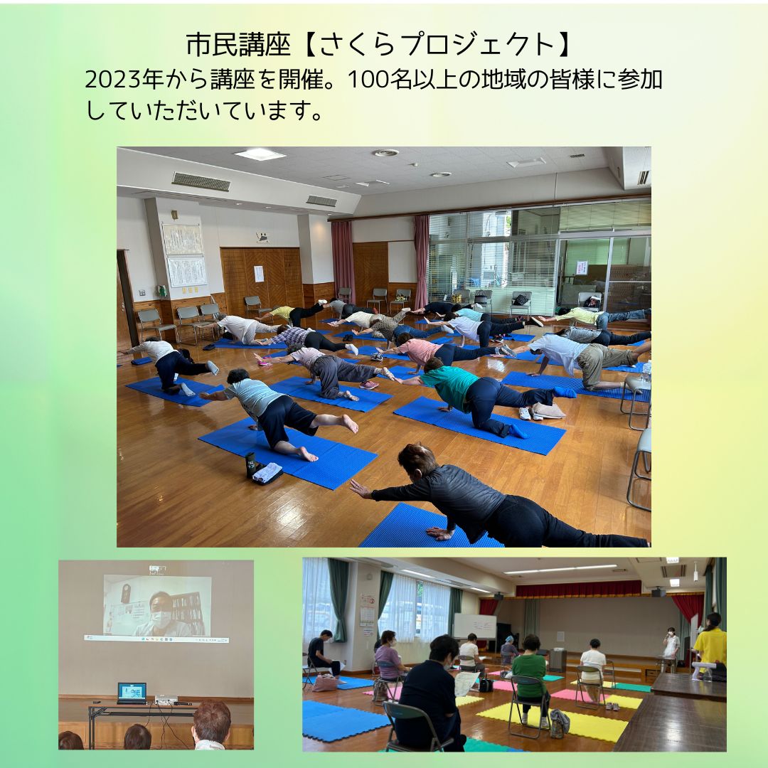 市民講座【さくらプロジェクト】の2025年度プログラムが終了しました。 本講座は、リハビリセラピストによる、健康維持のためのからだづくりを目的とした市民向け講座です。 2025年度は、年間5回の講座を3か所で開催しました。 リハビリセラピスト(理学療法士・作業療法士)による筋力トレーニングやストレッチを中心に、医師による運動の必要性についてのオンライン講話、看護師による熱中症・感染症予防の講座など、実践と知識の両面から健康づくりを支援しました。 本講座は開始から3年目を迎え、これまでに延べ100名以上の地域の皆さまにご参加いただいています。 今後も、理学療法士の専門性を生かし、地域の皆さまの健康づくりに貢献してまいります。 ![]() ケアハウスさくら 忘年会 2025年12月25日