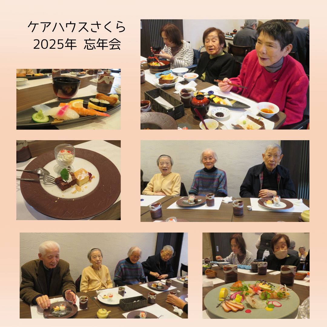 ケアハウスさくらでは、入居者様が参加され、外食会を兼ねた忘年会を開催しました。 「今年もおいしい食事を皆で味わえてうれしい」「普段なかなか味わえない非日常の料理を楽しめた」と、参加された皆様から好評でした。 また、入居者様同士の会話も自然と弾み、終始和やかな雰囲気の中で食事と交流を楽しまれていました。 本年も、入居者様ならびにご家族の皆様のご理解とご協力に心より感謝申し上げます。 来年も、皆様が安心して楽しく安全に過ごしていただけるよう、職員一同取り組んでまいります。 ![]() 🎄メリークリスマス🎄 2025年12月25日