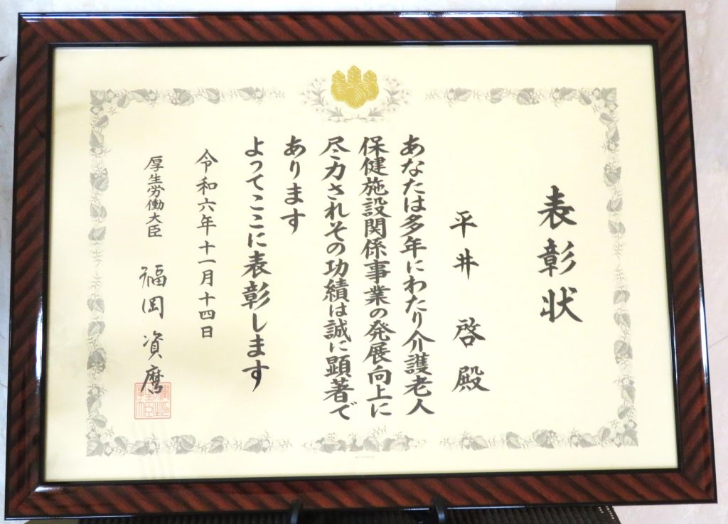当法人の平井啓理事長が、令和6年度の「介護老人保健施設事業功労者厚生労働大臣表彰」を受賞いたしました。