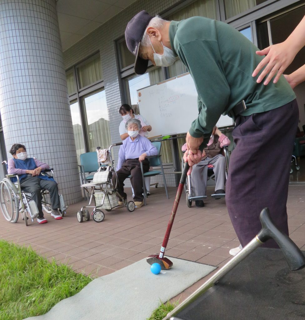 デイケアでは、さくら苑の広い芝庭でゴルフを行いました。1・2・3と書いた旗に向けて打ち、点数を競います。