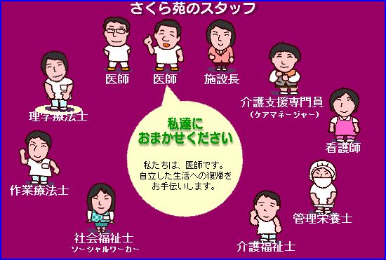「さくら苑(小倉南区)」は介護老人保健施設です。 介護老人保健施設(通称:老健)は、どんな方がご利用できるのか ご存知ですか? 「特別養護老人ホーム(通称:老人ホーム)」と同じと思っていらっしゃる方が多いのですが、老人ホームは「最期まで暮す、生活する場所」に対して、介護老人保険施設(老健)のさくら苑は、【在宅復帰(自宅に戻り今まで通りの生活レベルに戻すこと)】を目指し、医師をはじめ、看護師・介護士・理学療法士・ソーシャルワーカーなどが常勤し、医療をはじめ、看護・介護・リハビリ・ソーシャルワークサービスを行う施設です。(医師が常勤しているので、万が一のことがあっても、早急に対応ができます。) また【在宅復帰】を目指していますので、リハビリ、機能回復訓練等を行って、日常生活に必要な動作などができるように、1日のスケジュールを組み、家庭的な雰囲気の中で快適な生活をおくっていただけるよう、質の高いサービスを心掛けています。 ◆施設をご利用できる方 1.病状安定期にあり、入院治療を必要としない方 2.リハビリテーション、看護、介護を中心とした医療ケアを必要とする方 3.65歳以上で要介護度が1~5の認定がおりている方 4.40~64歳で特定疾患があり要介護度が1~5の認定がおりている方 ※見学や入所についてはお気軽にお電話下さい。また、短期入所ショートステイ(療養介護・生活介護)、通所リハビリテーション(デイケア)についても、随時ご相談を受け付けております。(*^_^*) ◎お問合せ先◎ TEL.093-475-3311 介護職員を募集しています 2013年2月4日