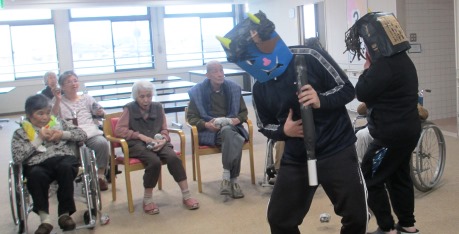 節分の日、さくら苑に現れた赤鬼と青鬼を、利用者の皆さんに退治して頂きました。