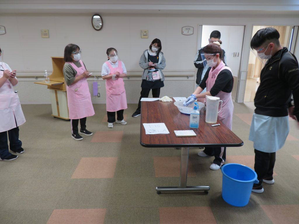 今回の研修では、色のついた手袋での手洗いを行ってみて、汚れの落ちにくい部分を確認しました。日々の作業に生かすよう努力します。