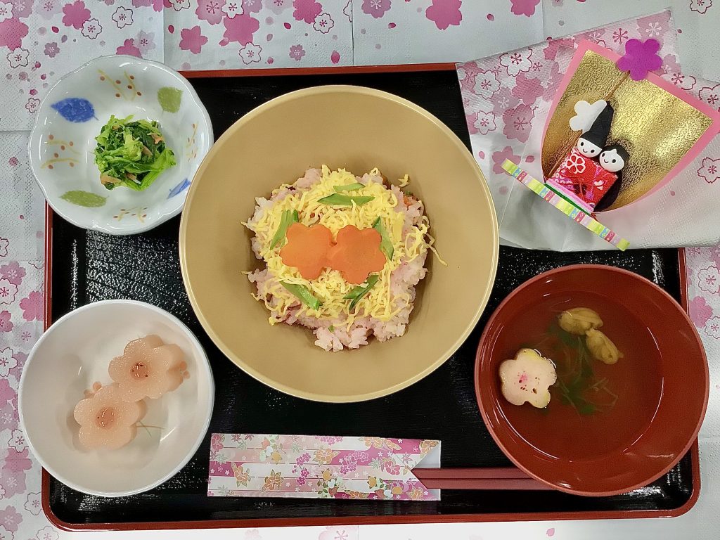 今年のひなまつりの献立は【ちらし寿司・あさりの清汁・菜の花の辛し和え・桃の水ようかん】。春の訪れを感じるメニューです。 ![]() 「お雛様」と「お内裏様」の衣装で記念撮影を行いました。 DVD鑑賞会 2023年3月4日