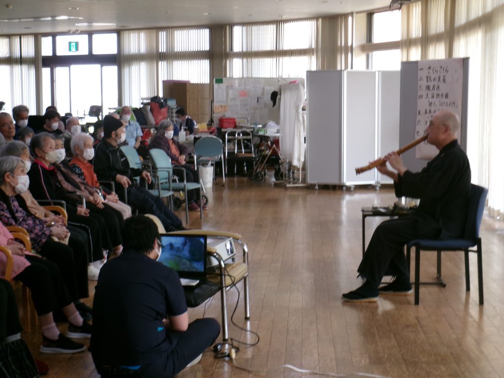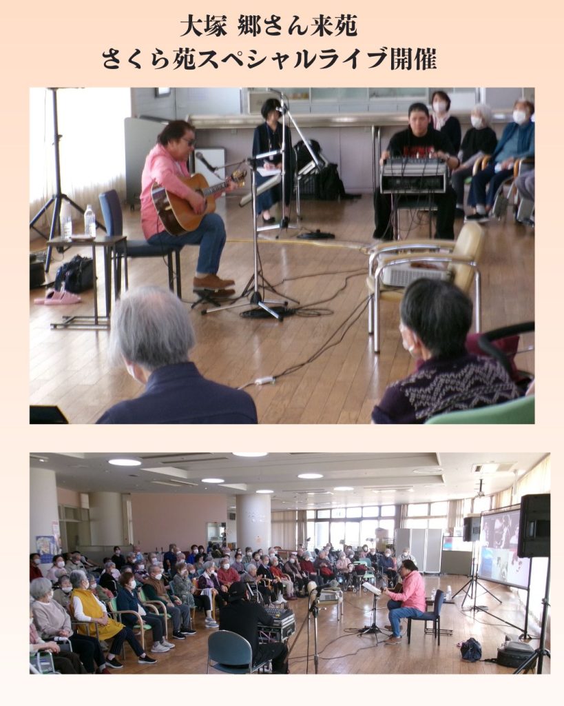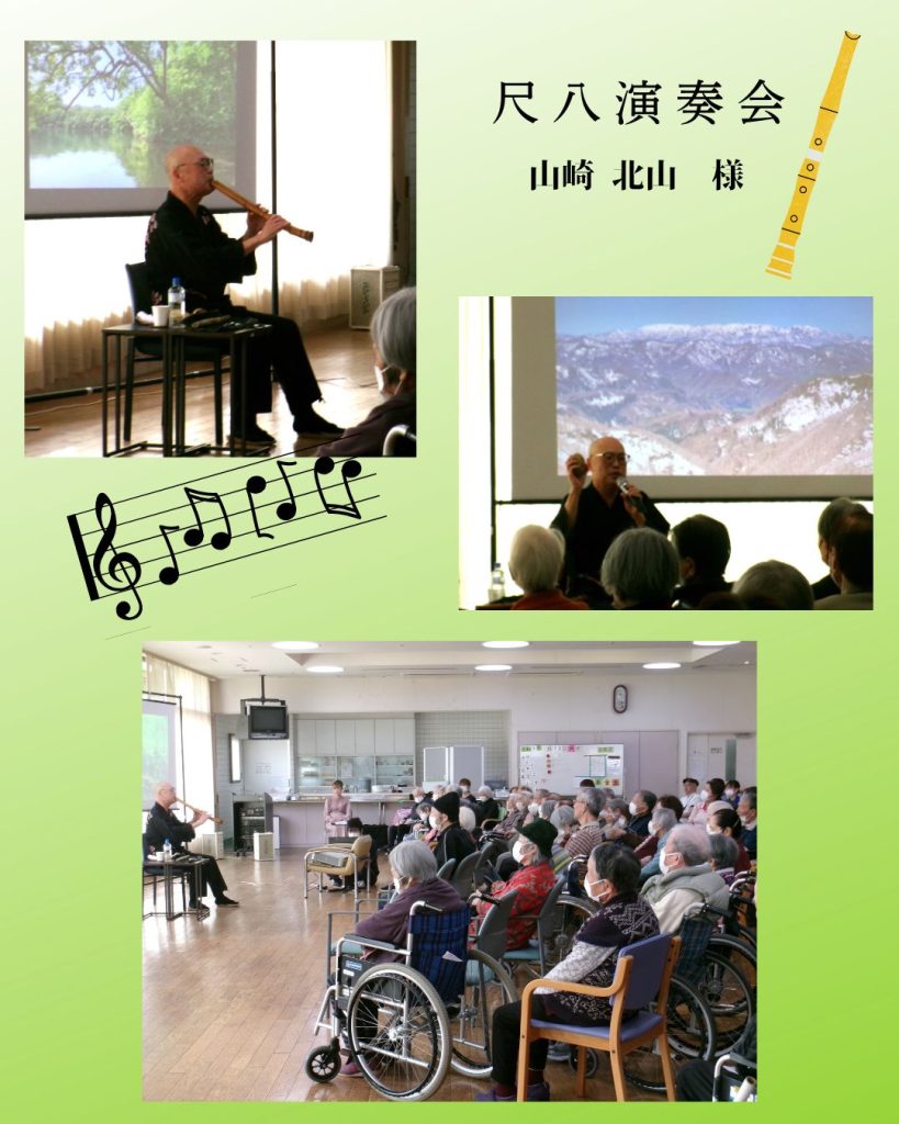 このたび、尺八奏者 山崎北山様をお招きし、演奏会を開催いたしました。 演目 ・さくら さくら ・鶴の巣籠 ・朧月夜 ・土笛独奏曲より『祈り』『ほたる幻想』 ・五木の子守唄~サマータイム ・コンドルは飛んで行く ・北国の春 ・遠くへ行きたい ・荒城の月 アンコールには「早春賦」と、懐かしさと趣のある幅広い楽曲をご披露いただきました。 尺八の一つひとつの音色がやさしく響き渡り、ご利用者の皆様は真剣な表情で耳を傾け、静かに聴き入っておられました。どの曲にもそれぞれの思い出が重なるようで、心に沁みるひとときとなりました。 山崎様からも「皆様が静かに聴いてくださり、とても心地よく演奏することができました」とのお言葉をいただいております。 ご参加いただいた皆様にとって、心が落ち着き、どこか懐かしさに包まれる穏やかな時間となりました。 ![]() 【特別企画】大塚 郷さんによるスペシャルライブ開催 2026年3月30日