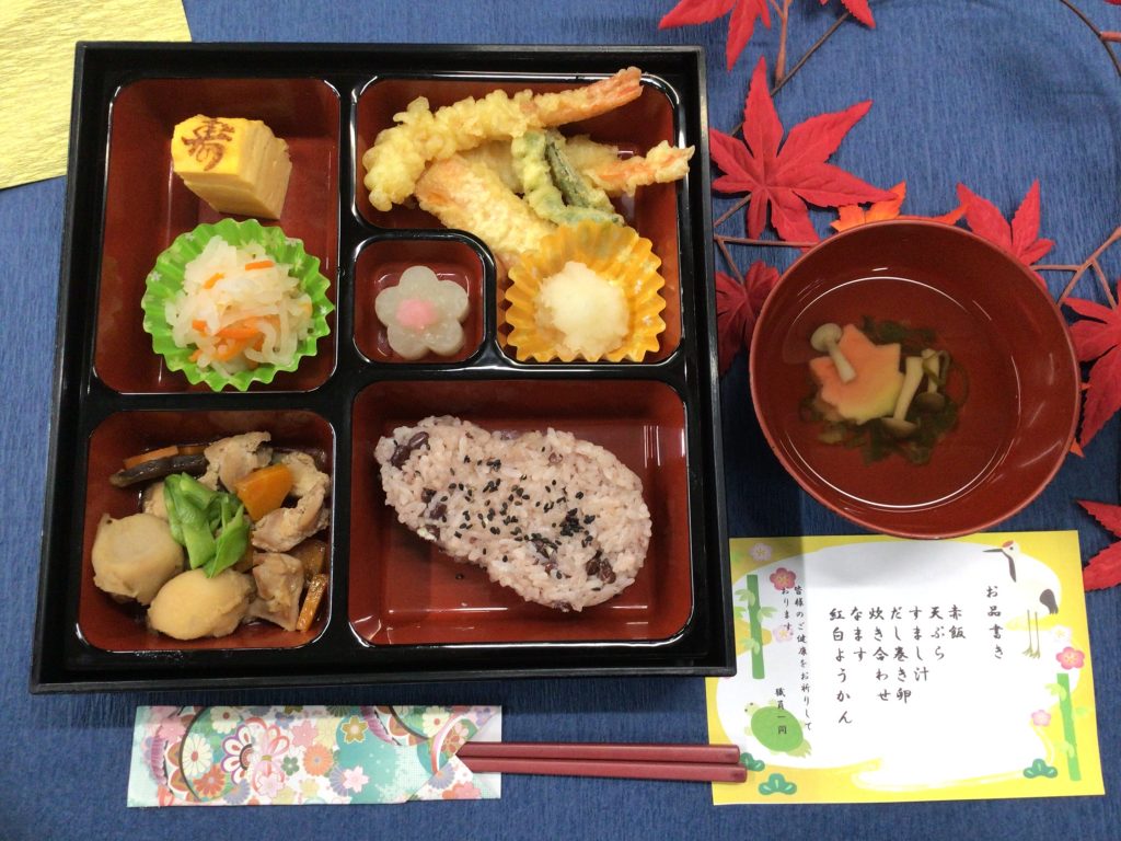 赤飯・天ぷら・清まし汁・だし巻き卵・炊き合わせ・なます・紅白羊羹